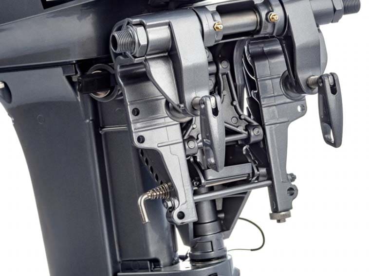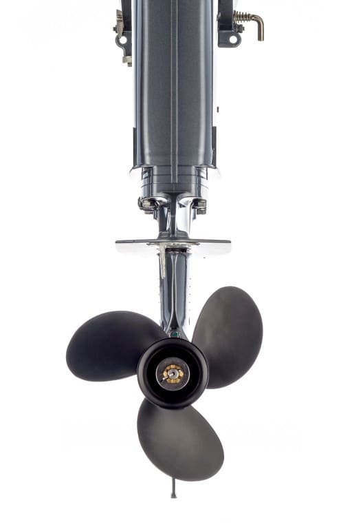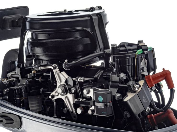 - Выпуск отработанных газов через ступицу винта обеспечивает тихую работу подвесного мотора.