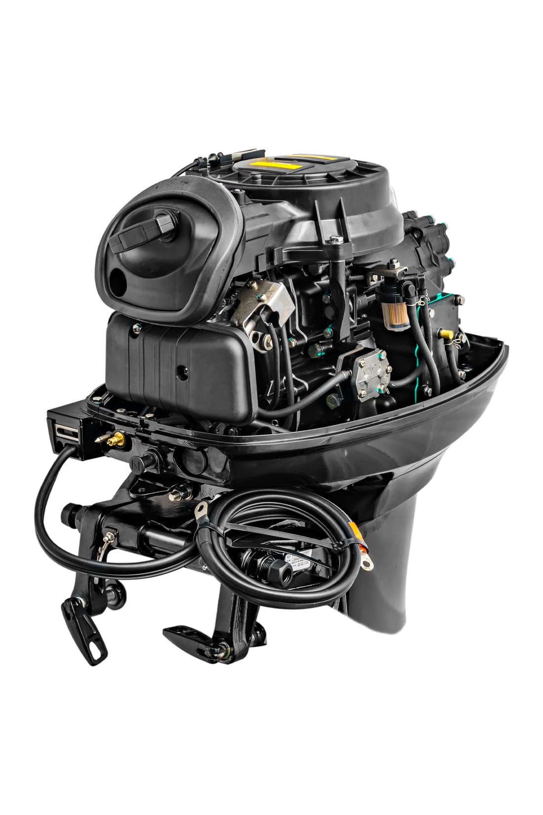 Его двухтактный двухцилиндровый мотор объемом 703 см3 развивает мощность в 40 л.с., весит 77.5 кг, что является неплохим сочетанием выдаваемой мощности и веса. Идущего в комплекте поставки внешнего бензобака на 24 л хватит на 3 часа работы на полном ходу. Коробка передач имеет три положения – нейтральное для запуска двигателя, переднюю и заднюю скорости. Различные режимы дифферента наклона двигателя позволят преодолевать мелководья без ущерба для винта и настроить оптимальный наклон для максимальных скоростных показателей. Усовершенствованная цифровая система зажигания CDI позволит с легкостью осуществить ручной или запуск двигателя в любых условиях, а инновационная система подачи топлива даст значительную экономию расхода топлива. Пятислойное лакокрасочное покрытие не только придает этому мотору красивый внешний вид, но и прекрасно защищает его от воздействия агрессивной внешней среды и дольше будет сохранять внешнее состояние мотора в эстетически достойном виде.