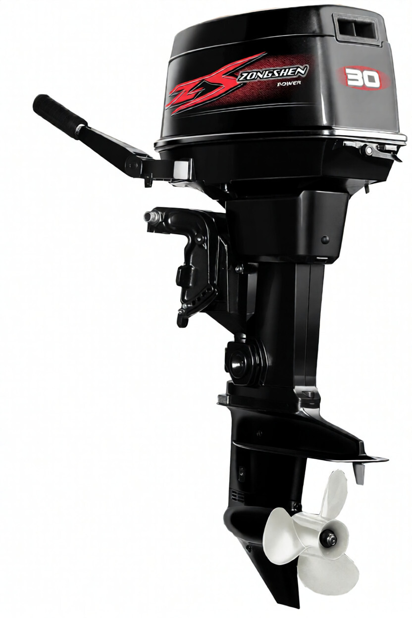 Подвесной мотор ZONGSHEN T30BMS развивает мощность 30 л.с. при объеме 489 см3. Количество цилиндров – 2, диаметр цилиндра 72 мм, ход поршня 60 мм. Максимальное число оборотов в минуту находится в пределах от 4500 до 5500.