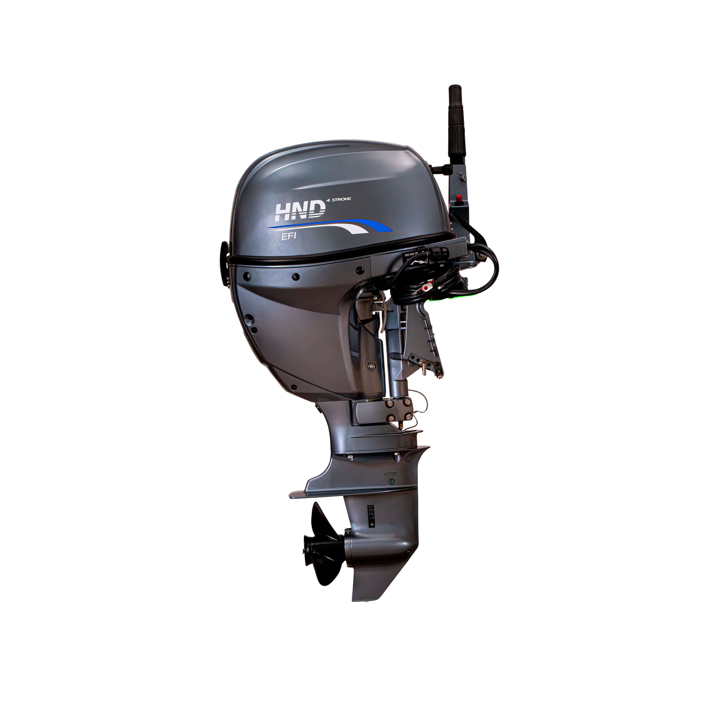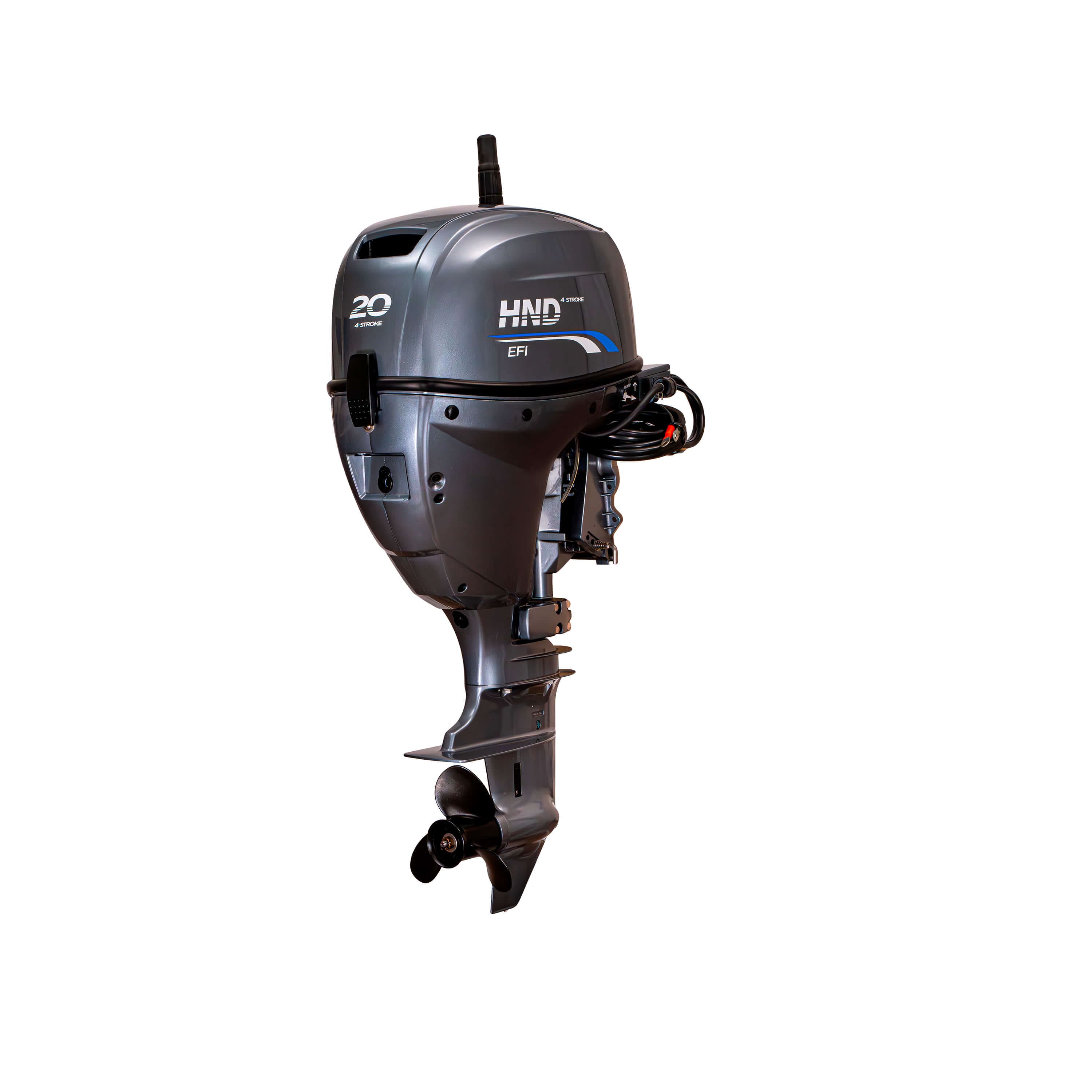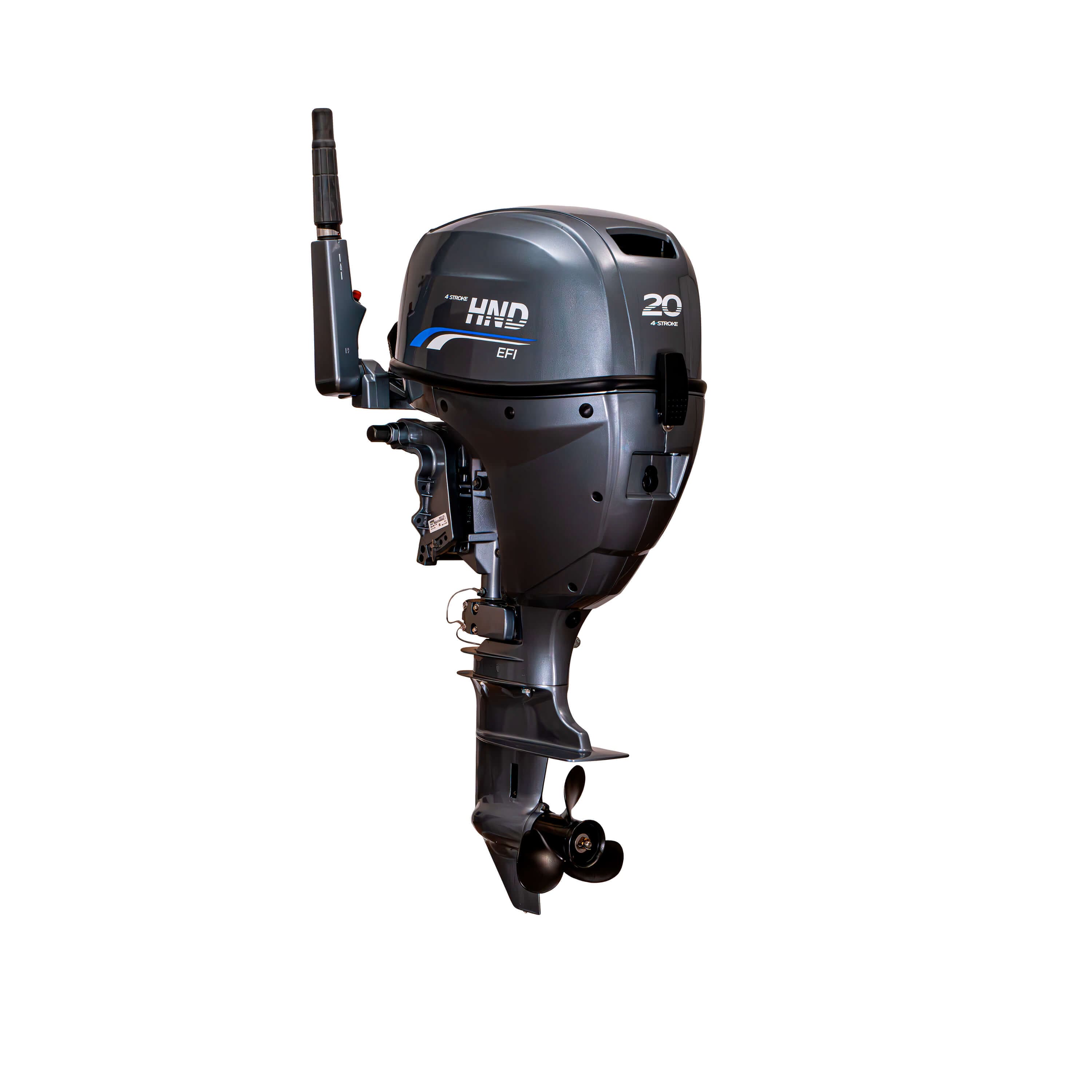 Представляем 4-тактный подвесной лодочный мотор HND 20 FIEHS номинальной мощности 20 лошадиных сил и рабочим объемом 345 см³. Время передовых технологий EFI! Описание МТО: F - 4-тактный двигатель; I - инжектор (EFI); E - электростартер; H - румпельное управление; S - короткий дейдвуд.