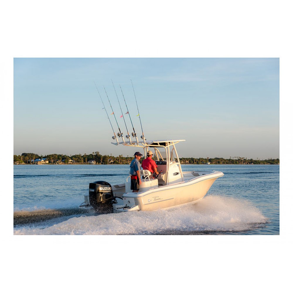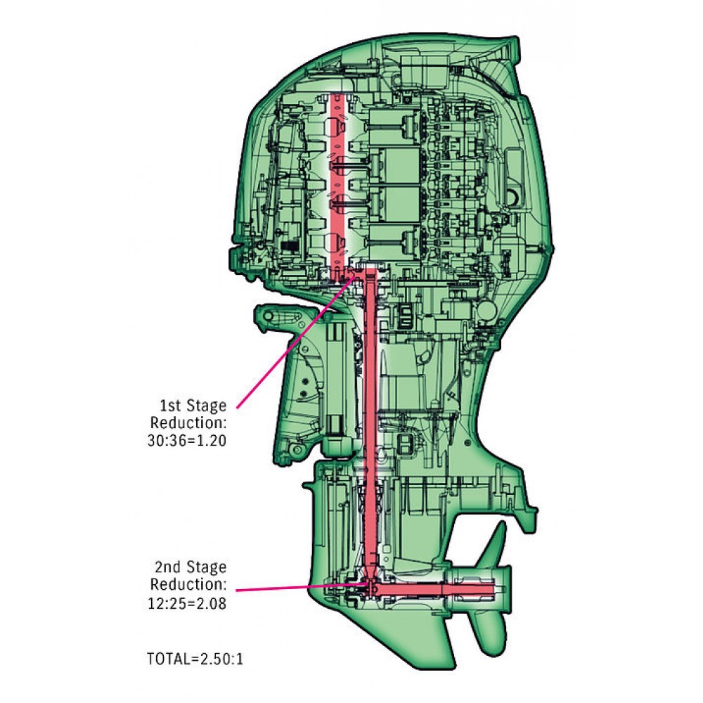 Кроме этого, направление вращения гребного винта можно всегда изменить, что, как правило, требуется при установке на лодку сразу двух подвесников. Теперь не нужно специально приобретать моторы с обратным вращением, которые, кстати говоря, не всегда имеются в свободной продаже. За основу двигателя мотора взят рядный 4-х цилиндровый 2867 кубовый блок цилиндров с DOHC (два распредвала над головкой блока цилиндров) компоновкой и четырьмя клапанами на цилиндр от уже давно производимых моторов DF150 и DF175. Но в отличие от них, на новых моторах используется более высокая компрессия. Высокая компрссия 10.2:1 позволяет снимать с двигателя больше мощности, что обеспечивает впечатляющий разгон и повышенный крутящий момент на средне-низких оборотах, необходимый для уверенного вывода лодки на глиссирование.