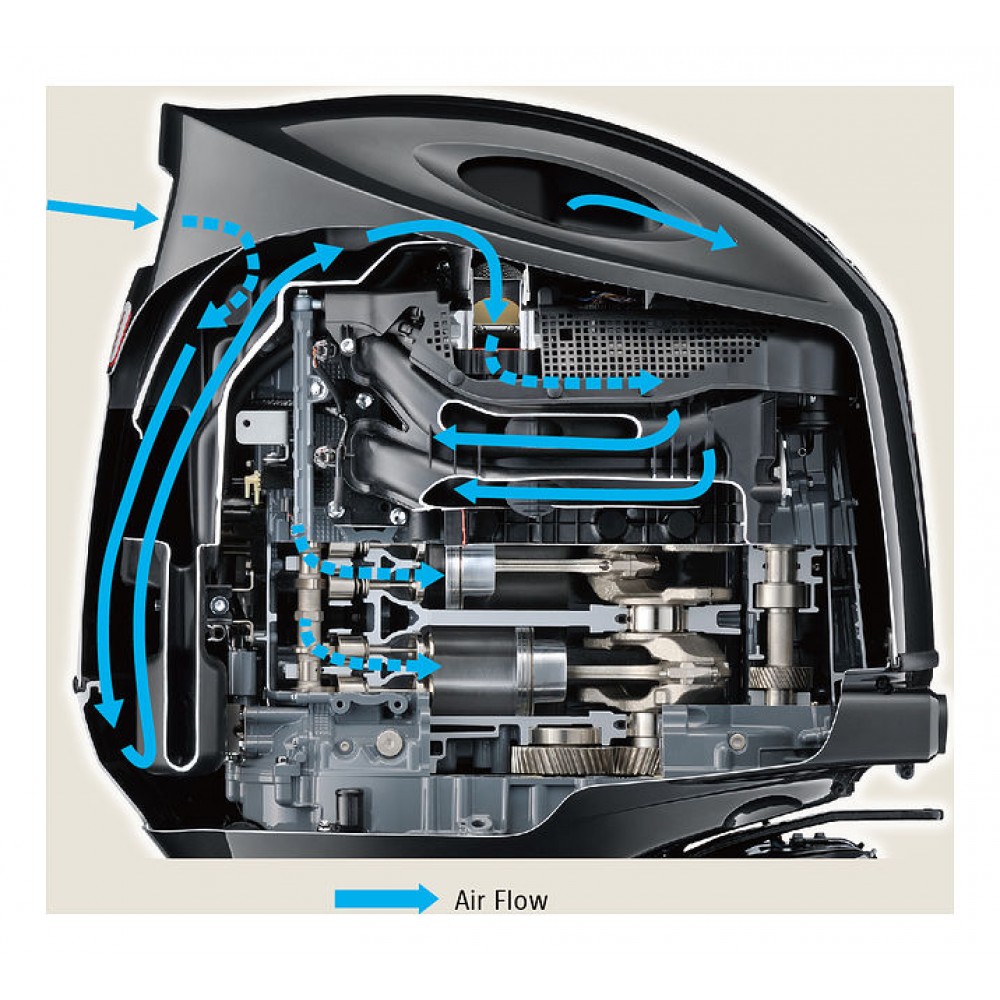 - Фирменная система двухступенчатой подачи воздуха в цилиндры лодочного двигателя.