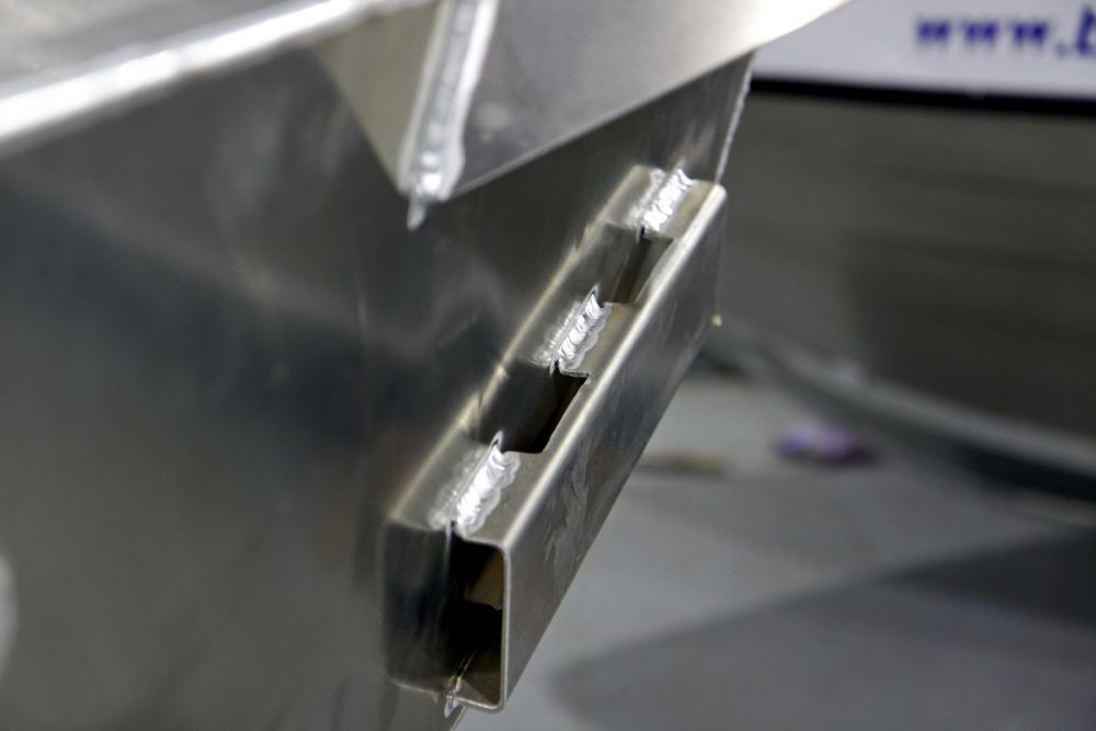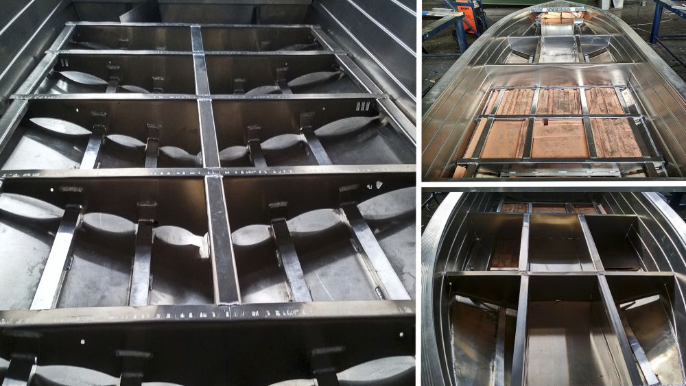 Прочность корпуса обеспечена применением листов толщиной 3 мм. на днище и транце, а так же продольно-поперечным набором.