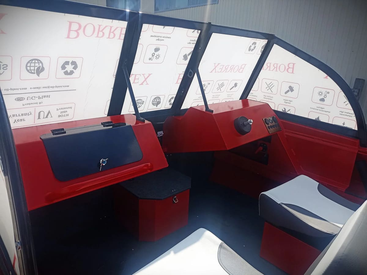 - Две консоли (судоводительская и пассажирская) из алюминиевого сплава с остеклением (каленое стекло), с форточкой, подсветкой и калиткой между ними