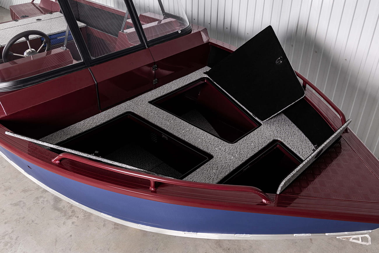 - Центральный рундук с возможностью размещения 5-и спинингов длиной до 2,7м (с водоотводящим комингсом), с откидной дверцей, возможностью размещения ходового тента и 3-х АКБ