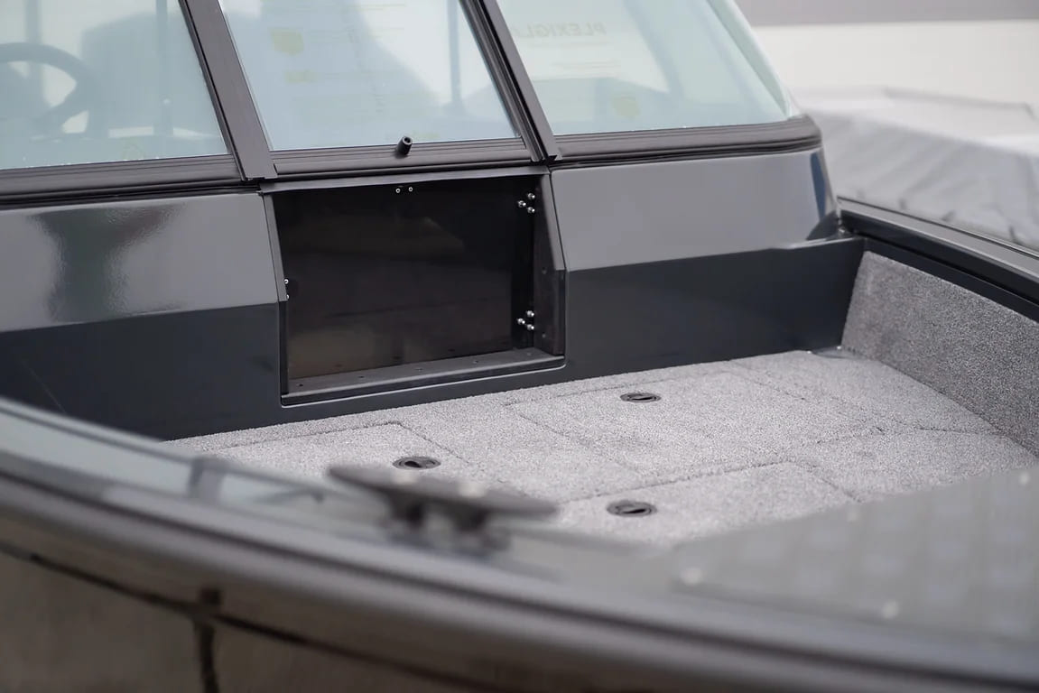 - Центральный рундук с возможностью размещения 5-и спинингов длиной до 2,7м (с водоотводящим комингсом), с откидной дверцей, возможностью размещения ходового тента и 3-х АКБ
