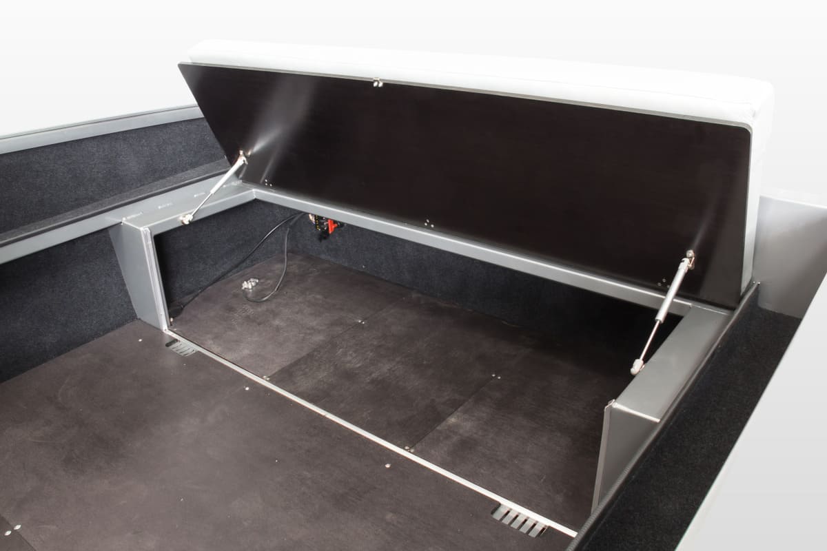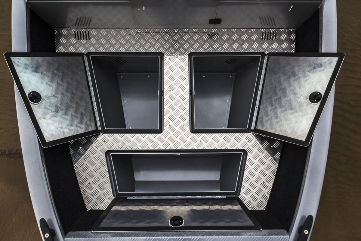 - Центральный рундук с возможностью размещения 5-и спинингов длиной до 2,7м (с водоотводящим комингсом), с откидной дверцей, возможностью размещения ходового тента и 3-х АКБ