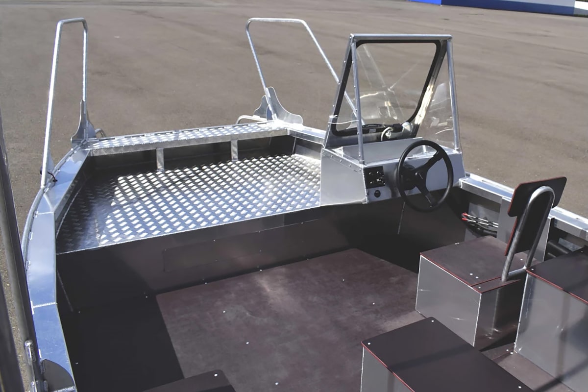 - Две консоли (судоводительская и пассажирская) из алюминиевого сплава с остеклением (каленое стекло), с форточкой, подсветкой и калиткой между ними