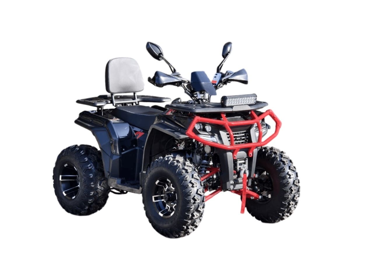 Квадроцикл AFC 200 PRO с 200-кубовым двигателем и мощностью 17 л.с. Имеет задний привод, вариаторную трансмиссию и гидравлические дисковые тормоза. Подходит для езды по бездорожью и перевозки грузов до 200 кг. Запуск двигателя — электростартер и кикстартер. Охлаждение воздушное с масляным подогревом.