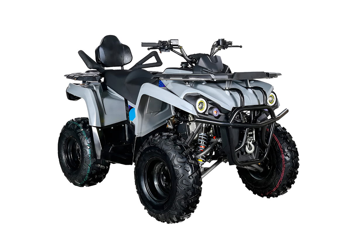 Квадроцикл оснащён четырёхтактным двигателем Juneng 163QMK с балансирным валом. Крепление мотора через сайлентблоки снижает вибрации и повышает комфорт при движении по неровной местности. Для удобства управления задний тормоз вынесен на руль — это освобождает пространство для ног и исключает риск случайного нажатия на педаль на сложных участках.