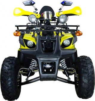 Сухая масса квадрика – 106 кг, при этом на борт он может брать до 150 кг. Таким образом, даже крупный взрослый с небольшой поклажей сможет добраться до точки назначения, ничего не сломав и не погнув. Объем бензобака у аппарата вполне приличный – 3,5 л, которого хватит, в среднем, на 100 км, в зависимости от дороги. Продуманные передние гидравлические дисковые тормоза отлично справляются со своей работой, обеспечивая быструю остановку в любой ситуации и на любой поверхности. Трансмиссия – полуавтоматическая, цепь – усиленная 428. Передняя подвеска – независимая 2-хрычажная на шаровых опорах с двумя амортизаторами, задняя – маятниковая с моноамортизатором. Обе исключают возможность пробоев при корректной эксплуатации на пересеченной местности и даже при совершении маленьких прыжков.