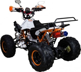 Габариты квадрика и грузоподъемность в 150 кг позволяют разместиться на нем с комфортом взрослому крупному человеку. Сидение удобное и достаточно мягкое, так что во время длительного катания руки, спина и шея уставать не будут. Несмотря на то, что квадроцикл Avantis Mirage 8М+ 125 кубов относится к разряду спортивных, сзади расположен открытый багажник, на котором при желании можно перевозить небольшие грузы. Колеса широкие, 8-дюймовые, на внедорожной резине с четко выраженным протектором. Глядя на них, веришь, что квадрик преодолеет множество серьезных препятствий на своем пути. Уверенности добавляют и входящие в комплект цепи противоскольжения, которые гарантируют веселые и безопасные покатушки даже на обледенелой трассе. Пластик ударопрочный, контрастных ярких оттенков. Насыщенные оранжевые элементы мгновенно привлекают к себе всеобщее внимание. А защита рук призвана уберечь тыльную сторону ладоней от царапин, фронтальных ударов и/или сильных порывов ветра.