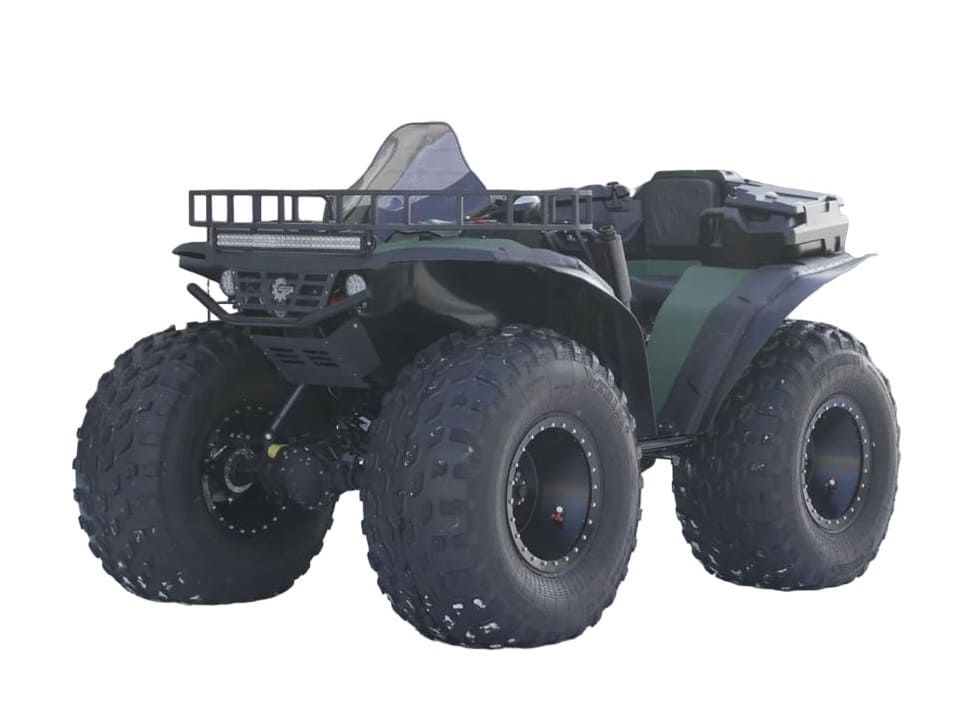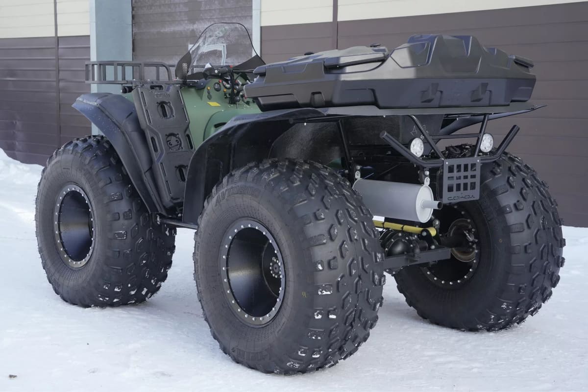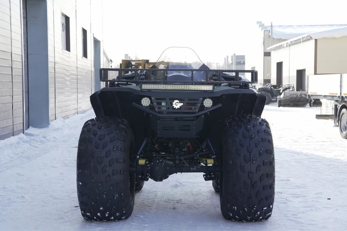 Квадроцикл оснащен мотором мощностью 110 л.с., что выдает достаточную производительность для эксплуатации техники в разных условиях. Средняя комфортная скорость передвижения составляет 60-70 км/ч, с максимальной ограниченной скоростью 85 км/ч. Благодаря таким показателя транспорт способен справляться со сложными маршрутами.