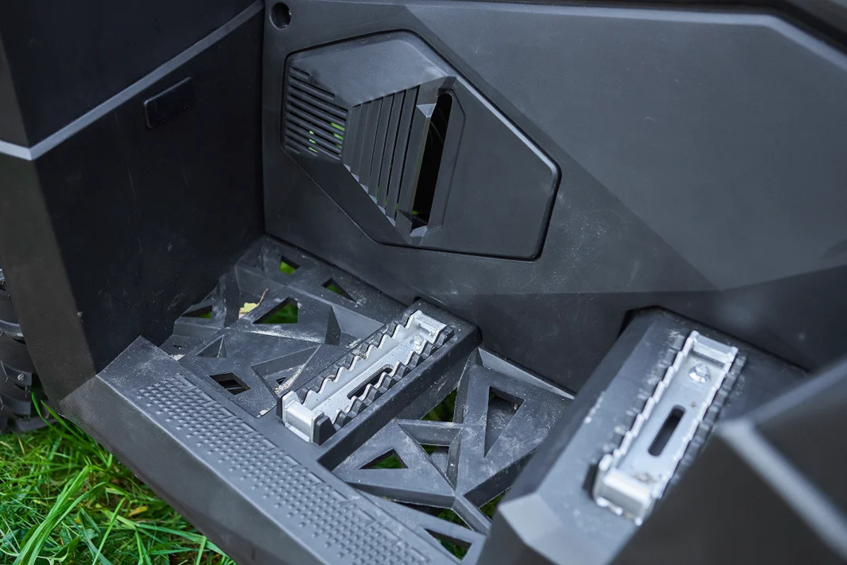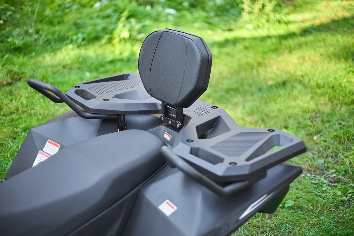 Быстросъёмная решётка радиатора позволяет за 30 секунд очистить его от грязи, предотвращая перегрев двигателя.Разнесённая гидравлическая тормозная система с ручными рукоятками и двойным стояночным блокиратором даёт полный контроль над торможением.Удобное мягкое сиденье с полноценным местом и спинкой для пассажира делает поездки комфортными даже на дальние дистанции.