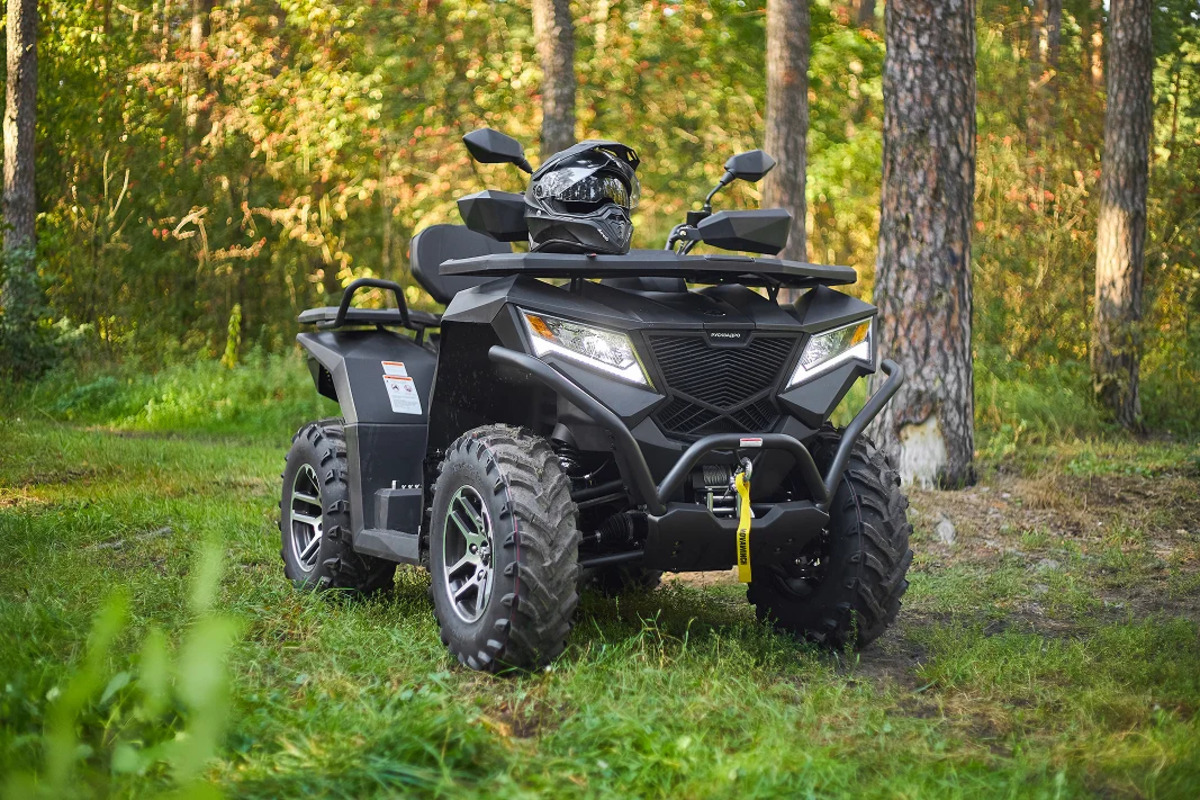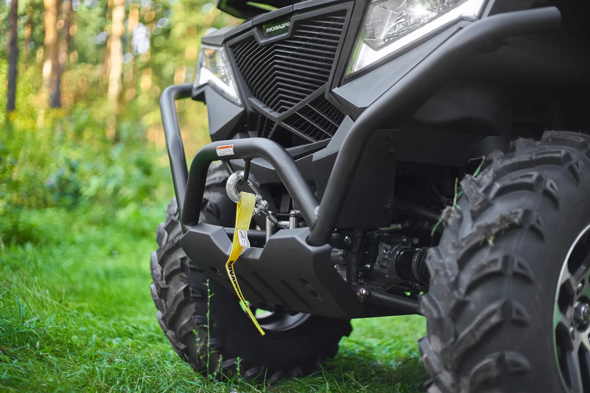 Подключаемый полный привод 4×4 с понижающей передачей и блокировкой дифференциала обеспечивает уверенность на грязи, склонах и колее.Лёгкосплавные диски 12" с разболтовкой 4×110 позволяют установить шины до 27" без потери динамики.Лебёдка с тяговым усилием 900 кг помогает выбраться из сугроба или грязевого плена без помощи извне.Привода усилены и рассчитаны на высокую нагрузку — квадроцикл выдерживает буксировку прицепа и перевозку груза.