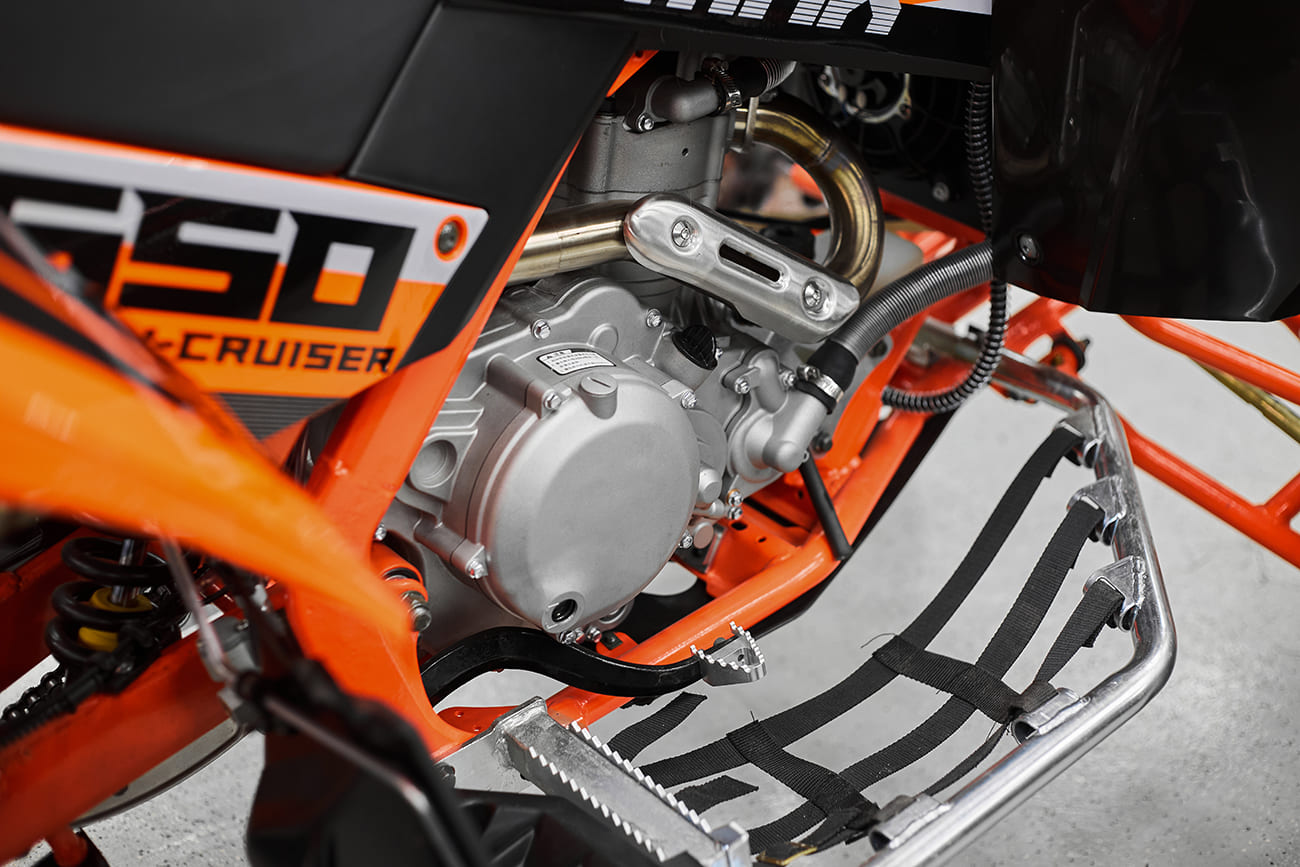 Sharmax 550 GX-Cruiser оснащён 449-кубовым, одноцилиндровым мотором ZS194MQ, который обеспечивает отличную мощность и динамику. В нем используется четырёхклапанная технология, увеличивающая эффективность сгорания топлива и минимизирующая потери энергии, что значительно улучшает отклик на газ. С максимальной мощностью в 50 л. с. этот мотор идеально подходит для гонок и экстремальной езды как на затяжных подъёмах, так и на скоростных прохватах.