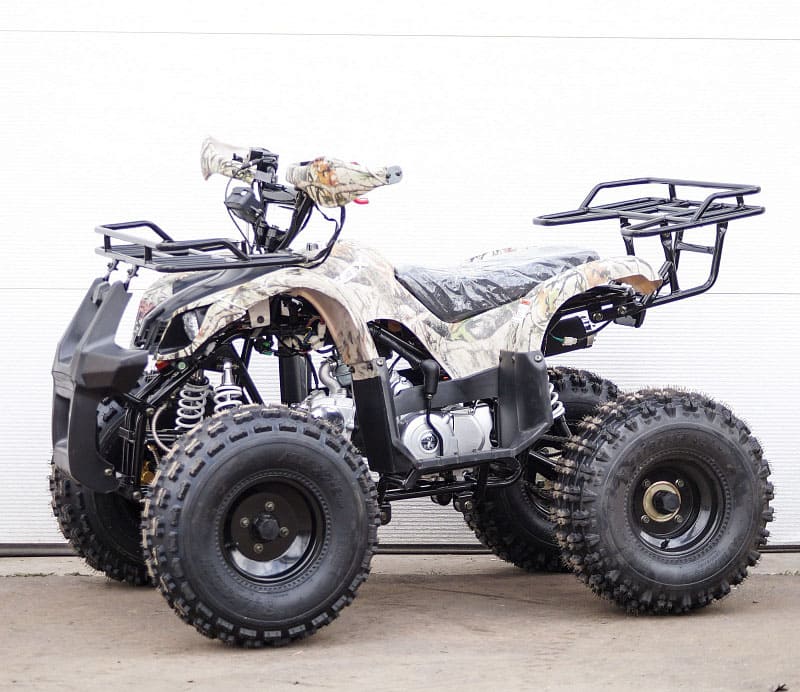Бензиновый 1-цилиндровый мотор объемом 125 см³ с воздушным охлаждением позволяет развивать мотовездеходу мощность 10 л.с. (7 кВт), обеспечивая базовую мощность для прогулочных поездок и легкого бездорожья. Вариаторная трансмиссия и цепной привод гарантируют плавный разгон без переключения передач, а ручной стартер с аккумулятором 12V/5Ah упрощает запуск даже в холодную погоду. Карбюраторная система питания и бак на 3.5 литра под бензин АИ-92 делают эксплуатацию экономичной, но требуют регулярной чистки фильтров при активной езде по пыльной местности.