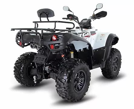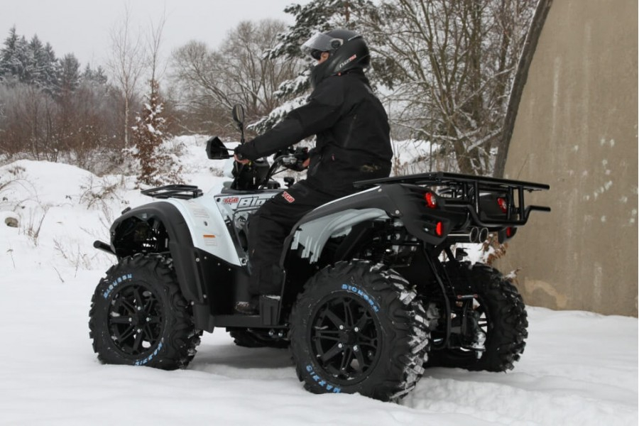Хромомолибденовая рама квадрика ТГБ выдерживает нагрузки, а габариты 215×124×128 см обеспечивают маневренность. Агрессивный стиль подчеркивают 14-дюймовые колеса, клиренс 142 мм и защитные дуги. Матовое покрытие кузова маскирует царапины, сохраняя презентабельный вид.
