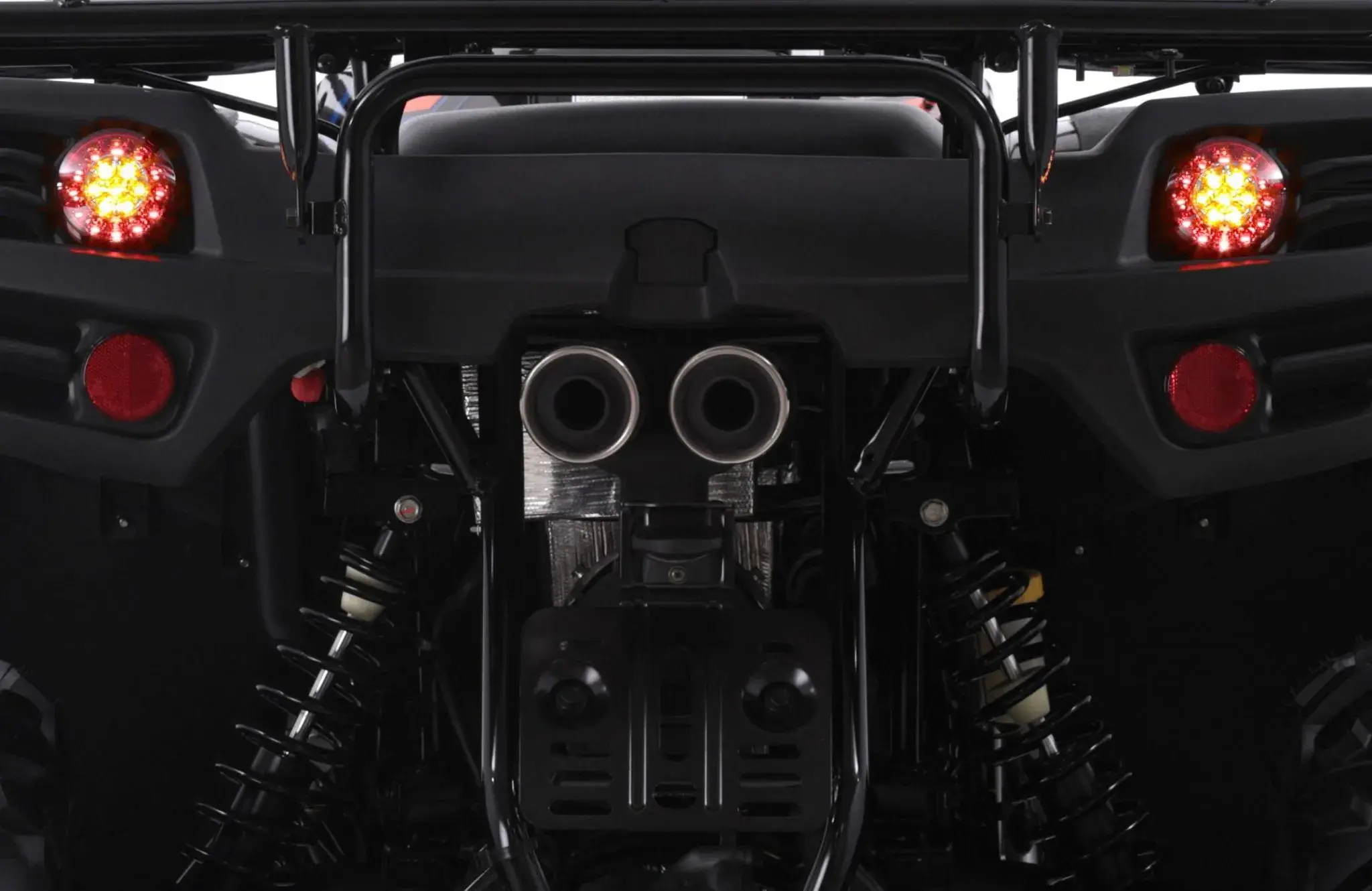 Хромомолибденовая рама квадрика ТГБ выдерживает нагрузки, а габариты 215×124×128 см обеспечивают маневренность. Агрессивный стиль подчеркивают 14-дюймовые колеса, клиренс 142 мм и защитные дуги. Матовое покрытие кузова маскирует царапины, сохраняя презентабельный вид.