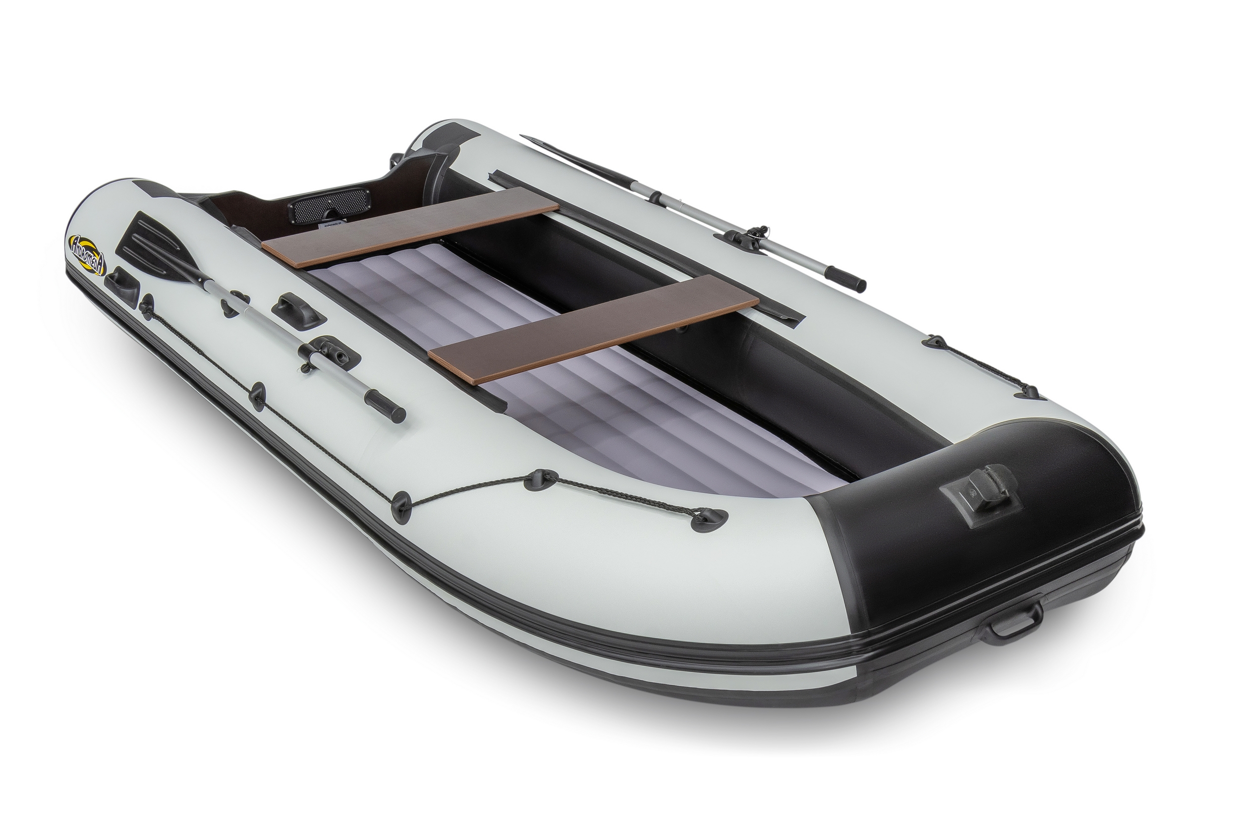 Лодка ПВХ Андромеда Air 360 — вторая по длине модель линейки. Отлично подойдёт для комфортной рыбалки 4 человек. Конструкция лодки выполнена в виде 3-секционного баллона, а отдельный надувной отсек значительно улучшает скоростные характеристики модели. Материал производства — высокопрочный ПВХ плотностью 1000 г/кв.м на баллонах и 1100 г/кв.м на днище. Материал с двусторонним полимерным покрытием, а также с добавлением термопластичного полиуретана. Это значит, что лодка готова к большим перепадам температур и спокойно выдержит рыбалку даже на 30-градусной жаре. Общая грузоподъёмность лодки составляет 650 кг, при собственном весе всего 40 кг. Для дополнительной безопасности модель оснащена подрывным и сливным клапанами, а оптимальная мощность мотора для Андромеда Air 360 составляет 18 л. с. Из интересных деталей можно отметить яркий контрастный дизайн модели, который делает её заметнее на воде.