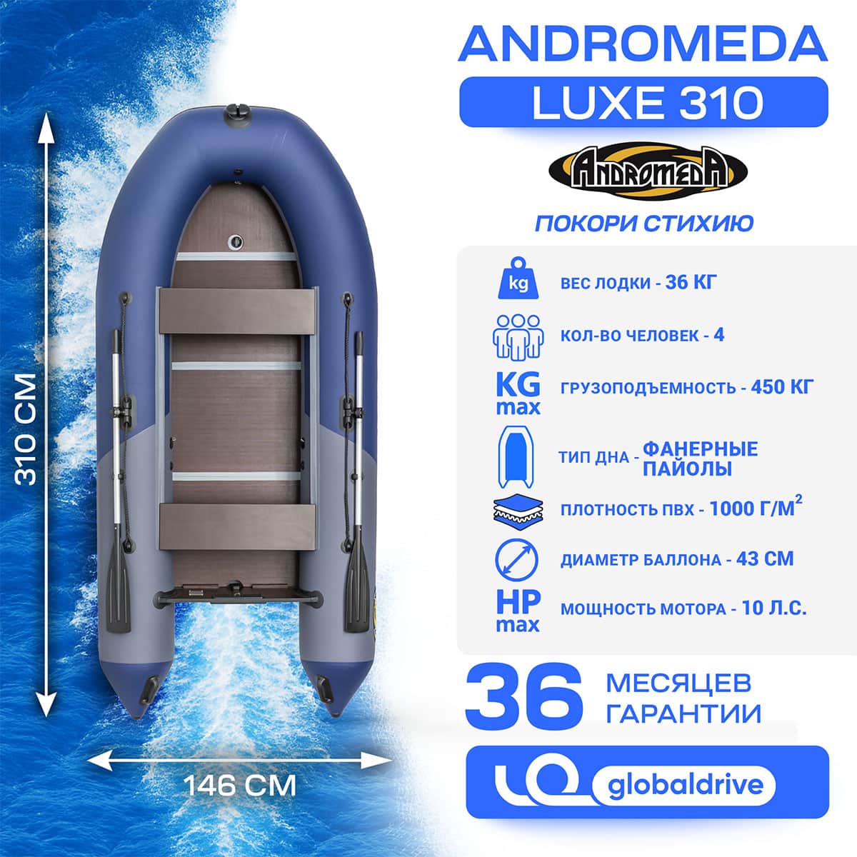 Надувная лодка «Андромеда» изготовлена из высокопрочной синтетической ткани с двусторонним полимерным покрытием ПВХ с добавлением термопластичного полиуретана. Применяемая ткань экологически безопасна, имеет высокие прочностные и климатические характеристики. Конструкция лодки исполнена в виде 3-х секционного надувного баллона.Для придания килевой формы днища конструкцией предусмотрен отдельный надувной баллон, улучшающий скоростные и мореходные характеристики лодки.