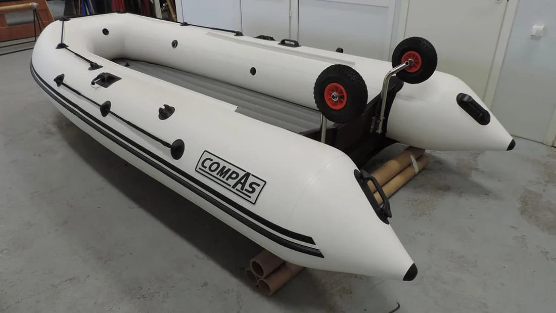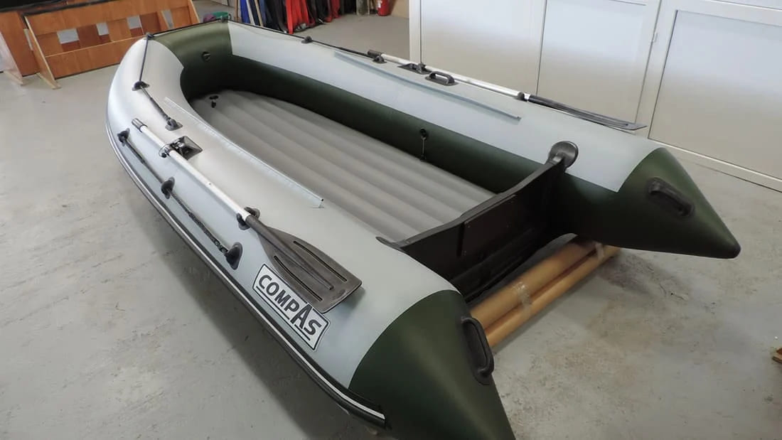Лодка Compas 380s с надувным дном низкого давления (нднд) с заданной килеватостью. Способ крепления надувного дна к баллонам исключает взаимный износ и запатентован.