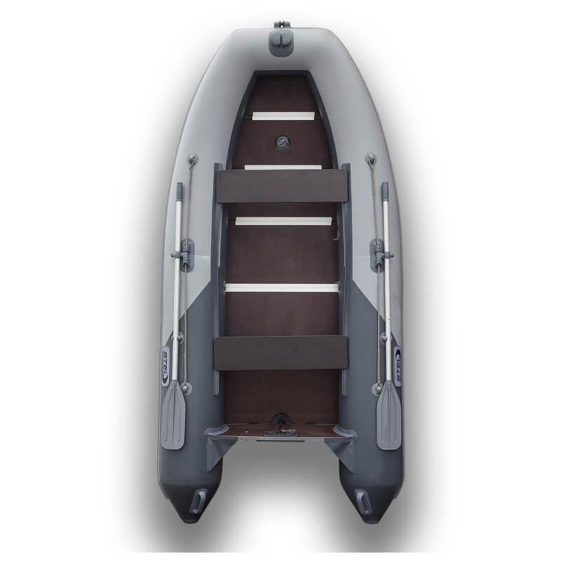 Данная моторная ПВХ лодка уже имеет все атрибуты для повышения мореходности и легкого выхода на глиссирование – киль, сплошной жесткий пайол, жестко вклеенный транец. Жеский пайол выполнен из высококачественной морской фанеры толщиной 12 мм и усилен алюминиевым стрингером.