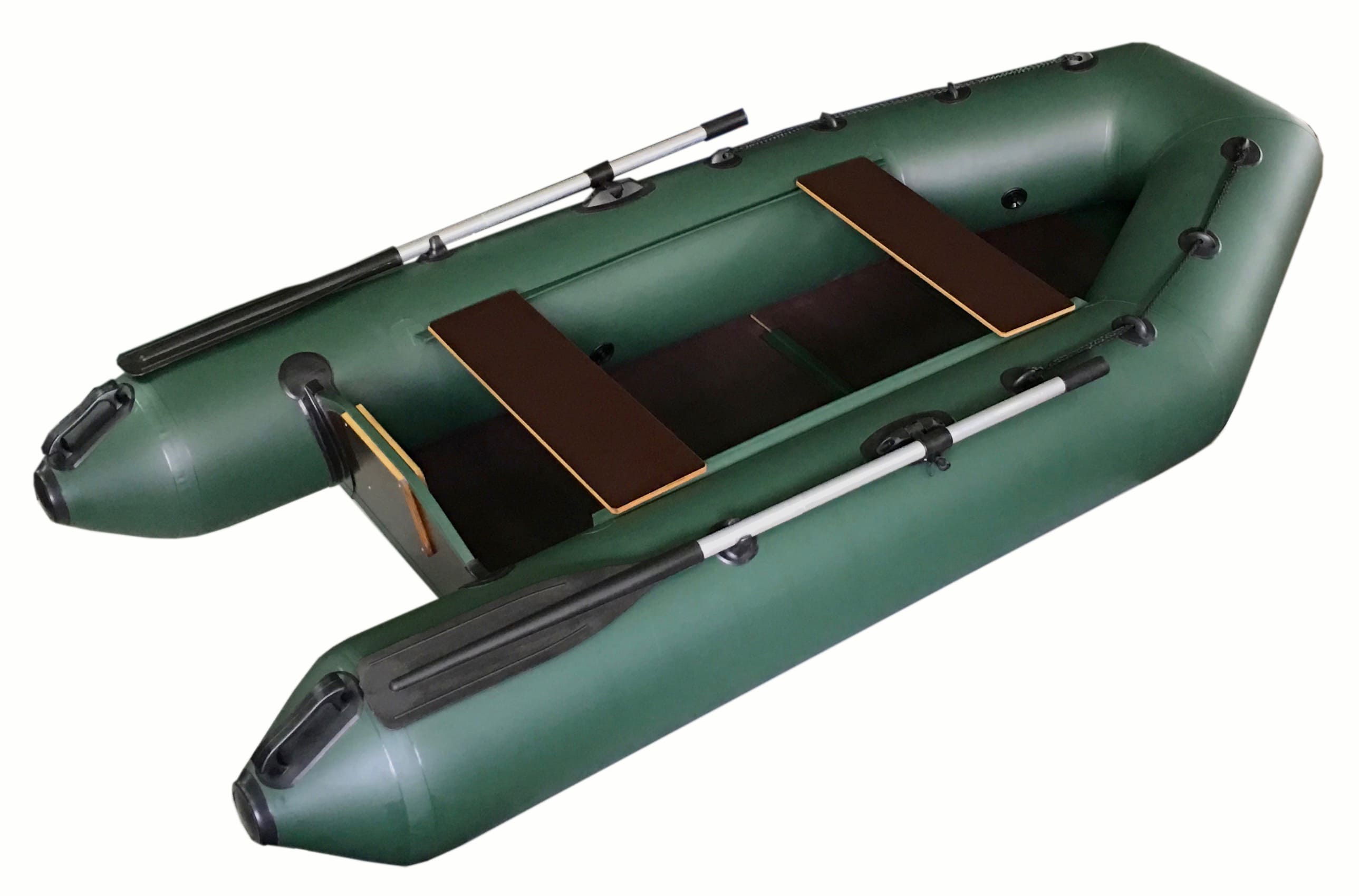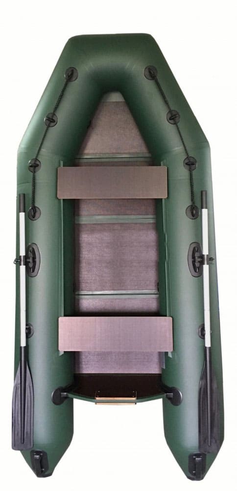 Надувная моторно-гребная лодка НЕГЛИНКА 270МК (складная слань + надувной киль) с Л-образным корпусом, разделенным внутренними перегородками на три автономных отсека и вклеенным жестким транцем. К корпусу лодки приклеено килеватое тканевое днище с надувным килем. На борта лодки приклеены поворотные уключины, фиксаторы весел, причальная шайба, шайбы леера и пояса для крепления подвижных сидений.