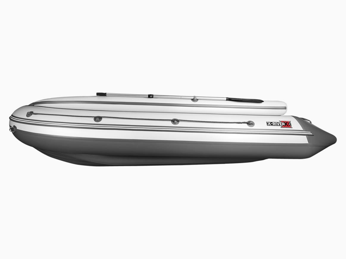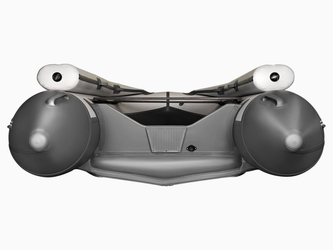 Лодка Grace 420 с тримаранным типом днища в комплектация с фальшбортом. Фальшборт выполнен с поперечной перегородкой. Это дает ряд преимуществ, в отличие от фальшбортов круглой формы.