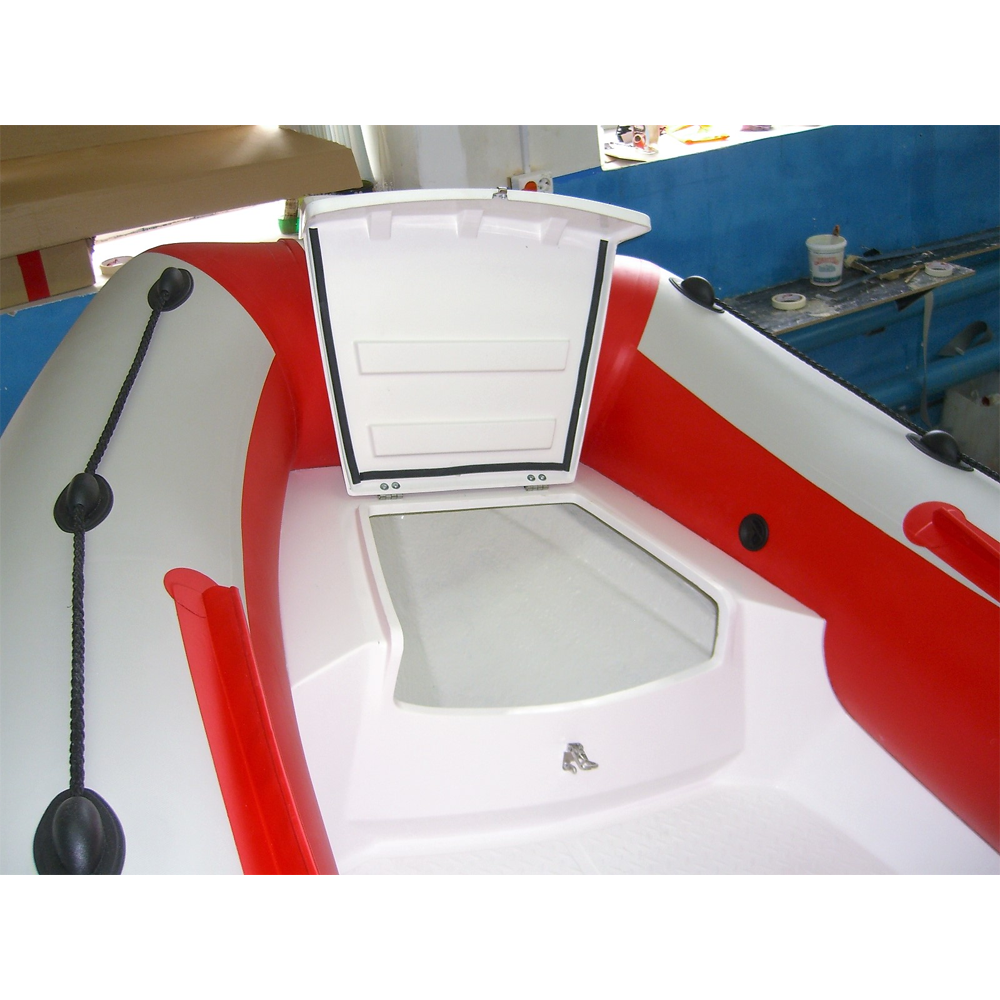 Жесткий стеклопластиковый реданированный корпус обеспечивает прекрасную курсовую устойчивость и уверенное прохождение поворотов. Высокая остойчивость позволяет безопасно и комфортно стоять, и перемещаться по палубе. Корпус состоит из трех частей. Все три детали склеиваются специальным клеем и образуют объемную, жесткую конструкцию. Каждая из этих трех деталей формуется в своей матрице. Внутри находится цельный "П" - образный стеклопластиковый кильсон, обеспечивающий жесткую связь между палубой и днищем.