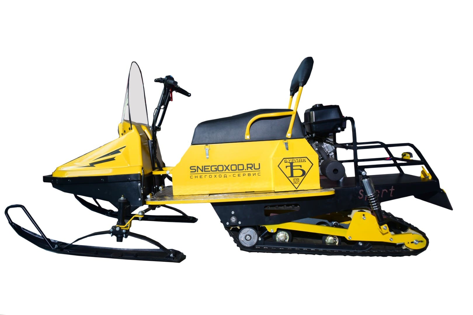 На Бурлак Егерь Спорт Лонг установлена склизовая подвеска, которая в сочетании с мощным двигателем 20 л.с. с центральным расположением и гусеницей 500 мм обеспечивает отличную проходимость по снежному покрову и дарит эмоции от уверенной эксплуатации техники