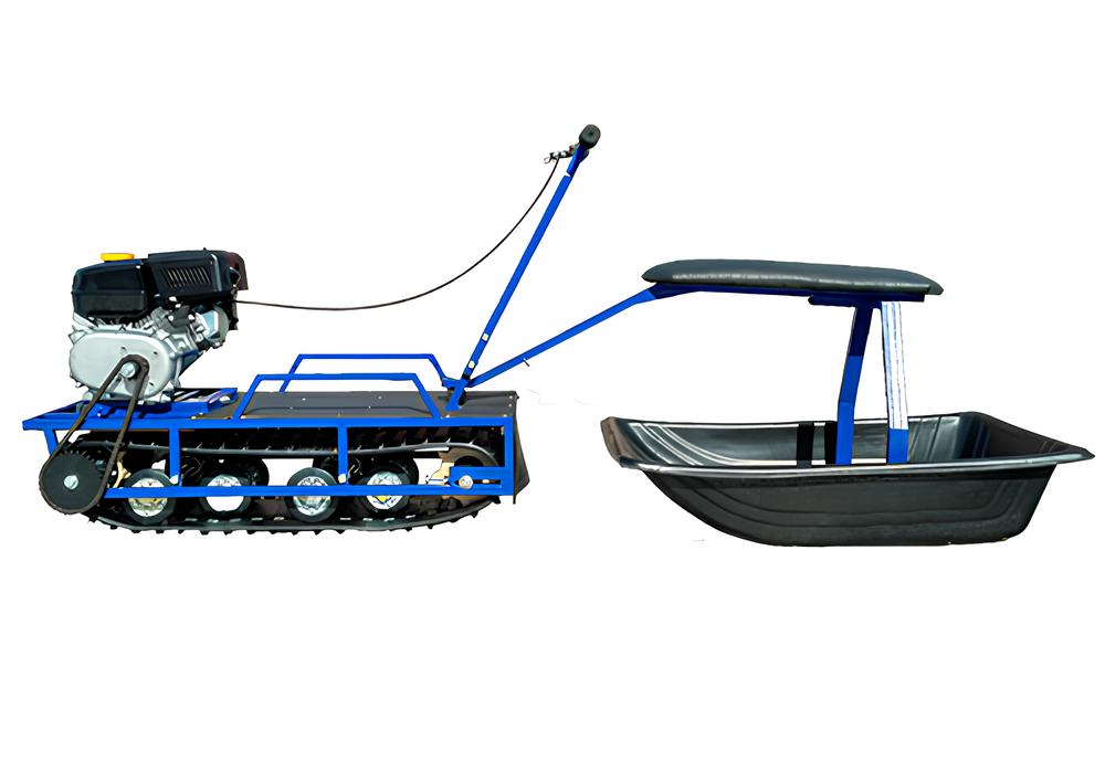 Двигатель Lifan 6,5 с редуктором 1/2 и автоматическим сцеплением. Возможность передвижения по снегу глубиной до 30см. Лучшая проходимость при своих габаритах благодаря тому, что вес водителя распределен между санями и буксировщиком.