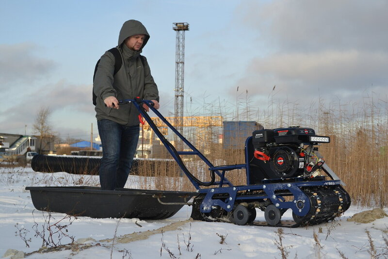 Мотособака весит 78 кг, а размер ее составляет 38 см в длину, 36 см в ширину и 36 см в высоту. Благодаря своим параметрам и конструкции мотобуксировщик может маневрировать и проходить по рыхлой и мягкой почве.