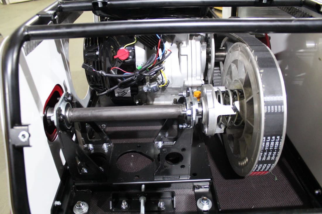 Рама максимально открытая, что улучшает выброс снега. Установлена защита нижней звезды. Двигатель и трансмиссия интегрированы на одной подмоторной плите, что позволяет точно выставлять шкивы относительно друг друга, вследствие чего устраняется перекос ремня вариатора и увеличивается его срок службы. Прочная стальная рама, каркас безопасности и металлический капот надежно защищают силовую установку мотобуксировщика.