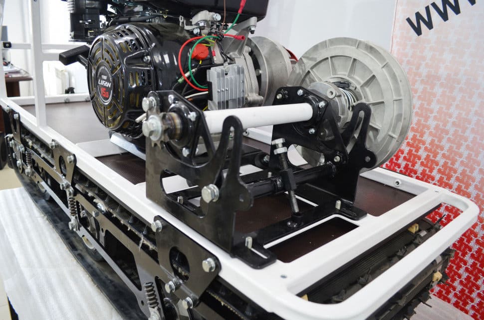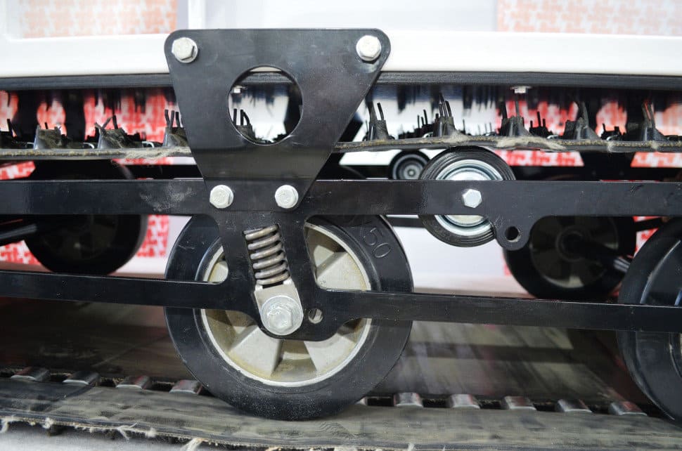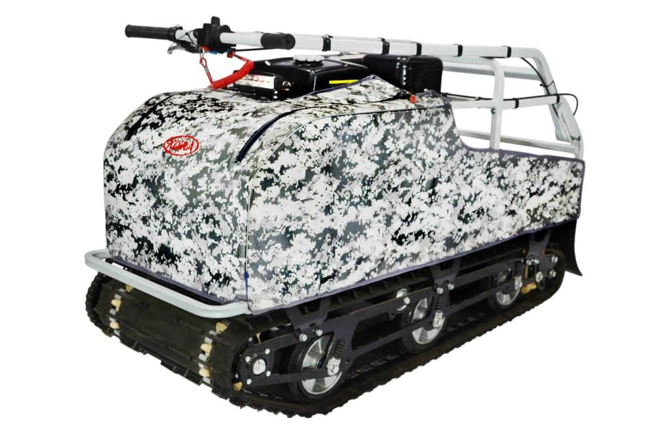Мотособака весит 115 кг, а размер ее составляет 145 см в длину, 58 см в ширину и 84 см в высоту. Благодаря своей легкости и компактности, мотобуксировщик способен маневрировать и проходить по рыхлой и мягкой почве. К тому же мотобукс оснащен катковой подвеской, которая сглаживает ход, обеспечивает устойчивость на неровной поверхности, смягчает удары и вибрации от дороги.