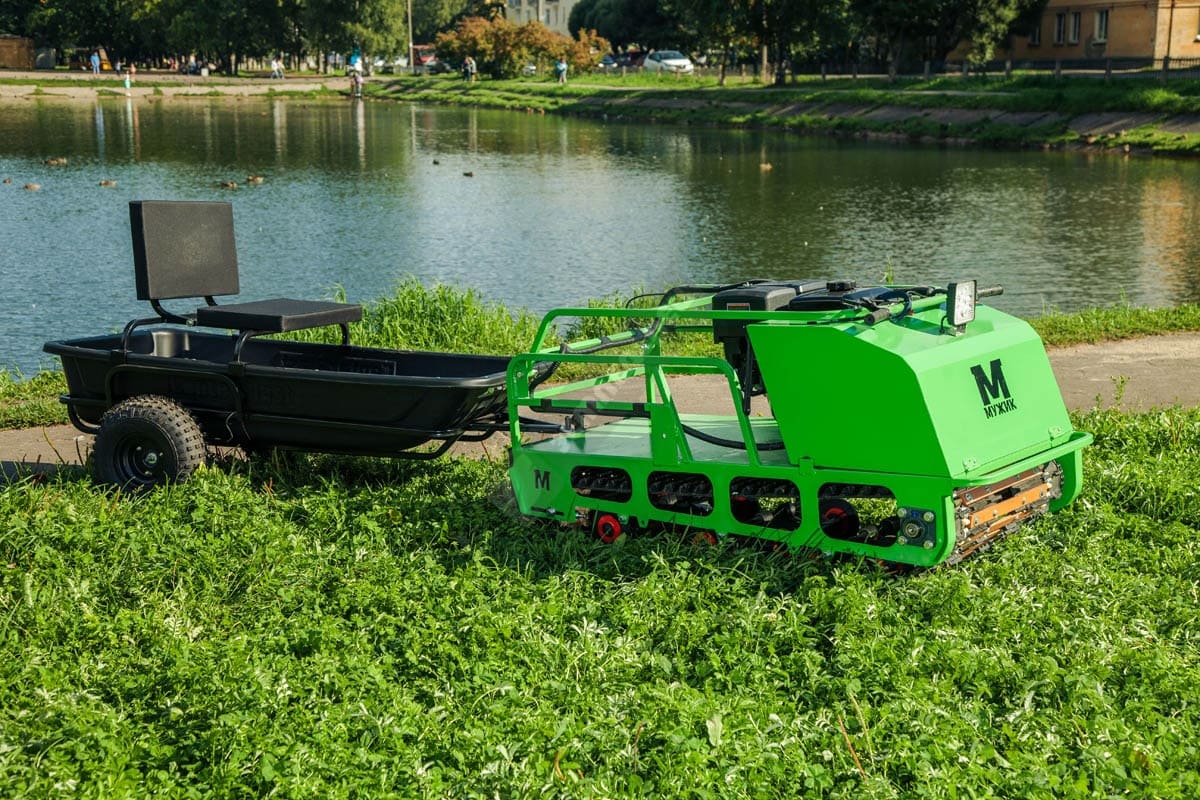 Увеличенный угол атаки позволяет с легкостью преодолевать глубокие снежные заносы. На ведущем валу мотобуксировщика установлены самоцентрующие подшипники. Смазка подшипника производиться без разборки ведущего вала и снят. Крепление руля вынесено выше платформы, что значительно повышает управляемость мотобуксировщика. Ширина руля средняя, что облегчает управление мотобуксировщиком в болоте и лесу. На мотобуксировщике установлен фаркоп. Это упрощает процесс крепления саней к мотобуксировщику, в отличии от стандартных прицепных устройств, где используется обычный рымболт.
