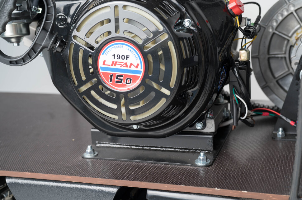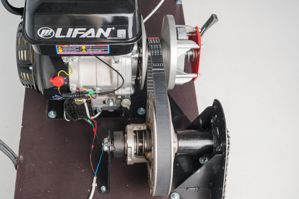 На мотособаке установлен вариатор Сафари, который обеспечивает постоянную передачу мощности от двигателя к колесам при изменении скорости. Он позволяет плавно регулировать скорость и обеспечивает оптимальное использование мощности двигателя.