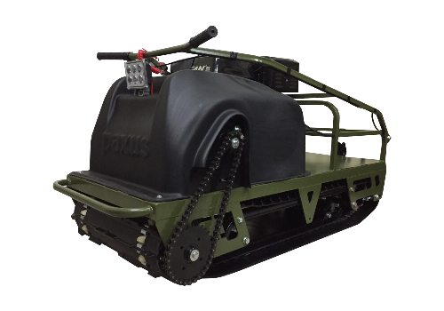 Этот мотобукс оснащен 4-х тактным двигателем мощностью 9 л. с., что позволяет достигать скорости до 45 км/ч. Это позволяет быстро перевозить груз весом до 40 кг, а также дополнительно до 200 кг в санях. Объем двигателя составляет 270 кубических сантиметров, а топливный бак имеет объем 6,5 литров.