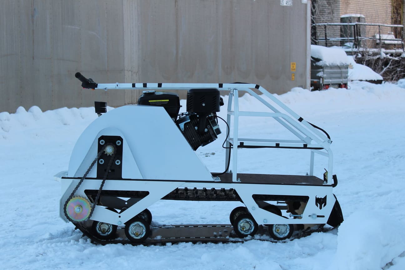 Мотособака весит 145 кг, а размер ее составляет 150 см в длину, 63 см в ширину и 80 см в высоту. Благодаря своей легкости, мотобуксировщик может маневрировать и проходить по рыхлой и мягкой почве. Кроме того, у мотобукса есть катковая подвеска, которая улучшает ход, обеспечивает устойчивость на неровной поверхности, а также смягчает удары и вибрации от дороги.