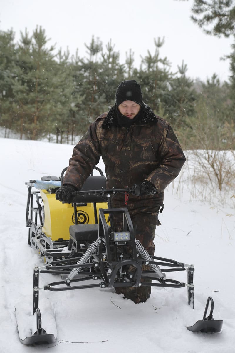 В конструкции мотовездехода используется цельная резиновая гусеница Composit шириной 500 мм. Гусеница в сочетании с катковой подвеской способна проходить спокойно по льду и даже по территории без снега.