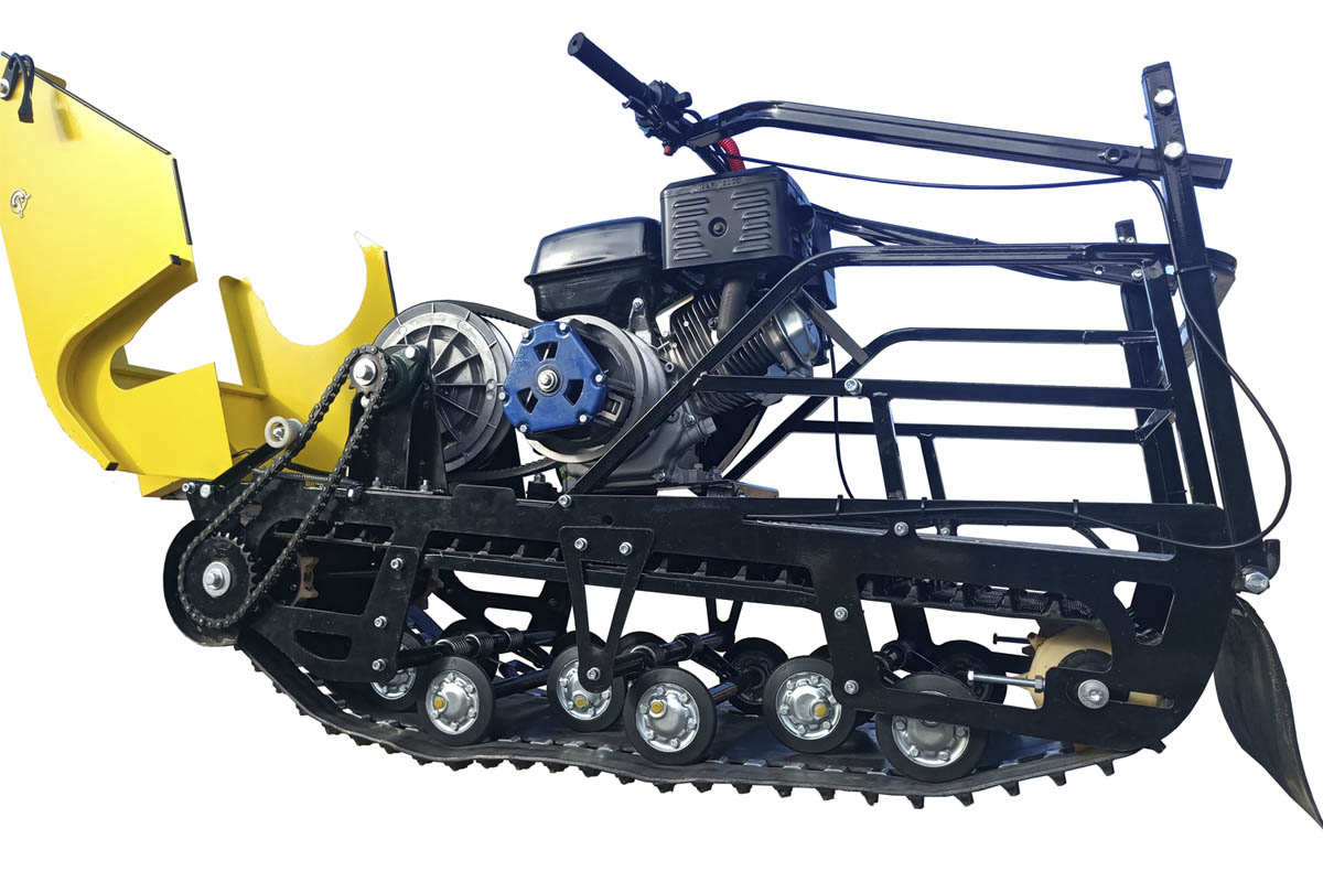 В конструкции мотовездехода используется цельная резиновая гусеница Composit шириной 500 мм. Гусеница в сочетании с катковой подвеской способна проходить спокойно по льду и даже по территории без снега.