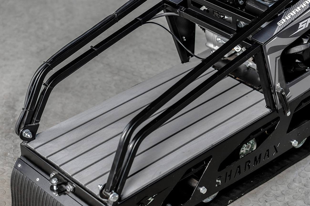 Конструкция мотобуксировщика Sharmax S380 устроена таким образом, что позволяет без особого труда устанавливать к ней и использовать любые шасси, предназначенные для различных условий эксплуатации. Универсальные посадочные отверстия основы и кузова мотобуксировщика Sharmax S380 могут использоваться на склизовой, катковой и даже колёсной подвеске.