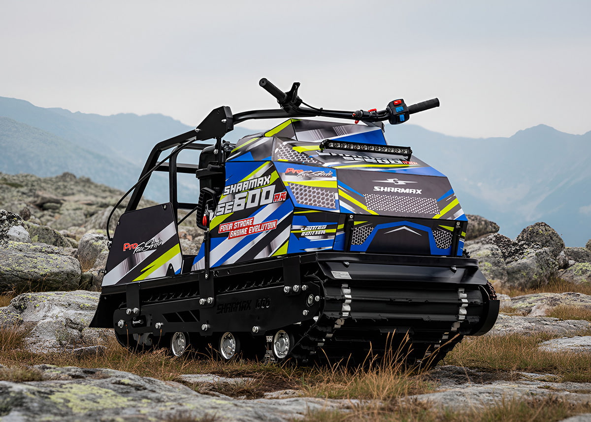 Уникальная конструкция рёбер жёсткости и формы кузова позволила избежать избыточного веса мотобуксировщика, и даже на 7% уменьшить вес среди аналогичных классов моделей других брендов. Теперь сухая массе Sharmax SE600 составляет всего 115 кг. Данный кузов не абсолютно не имеет аналогов на рынке России.