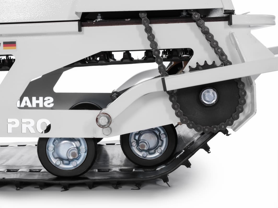 Универсальная посадочная база подвески мотобуксировщика. Конструкция мотобуксировщика Sharmax устроена таким образом, что позволяет без особого труда устанавливать к ней и использовать любые шасси, предназначенные для различных условий эксплуатации. Универсальные посадочные отверстия основы и кузова мотобуксировщика Sharmax могут использоваться на склизовой, катковой и даже колесной подвеске. Также возможна установка лыжного модуля. Мы можем предложить для вас подвеску на любой вкус и установить ее сразу или отправить в комплекте с техникой. Стандартная гусеница мотобуксировщиков "Sharmax" шириной 500 мм является самой универсальной, надёжной и популярной. Уникальный рисунок протектора с длиной грунтозацепа в 21 мм создаёт наилучшее сцепление для неглубокого снега и трасс. Благодаря этому вы сможете сохранять высокую управляемость и скорость в большинстве ситуаций. Если же приключится беда, то найти части для неё не составит ни малейшего труда.