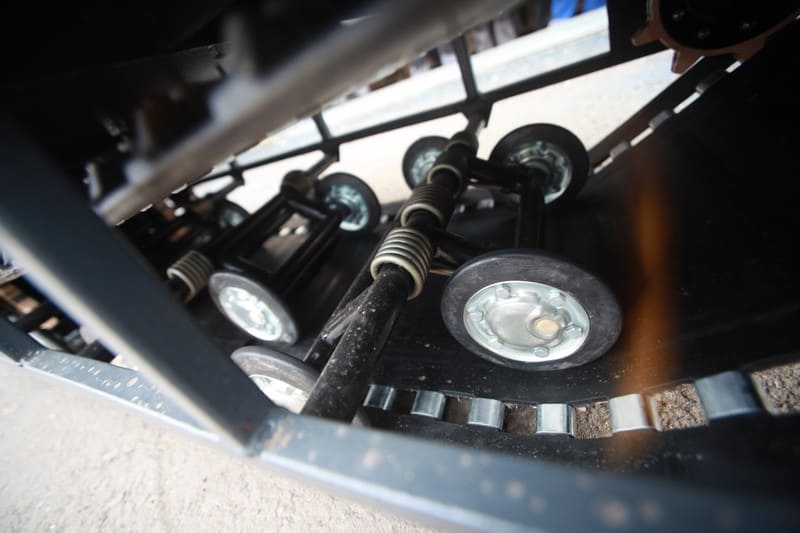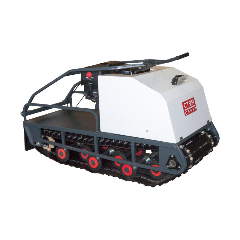 В конструкции мотовездехода используется цельная резиновая гусеница шириной 500 мм. Гусеница в сочетании с катковой подвеской способна проходить спокойно по льду и даже по территории без снега.
