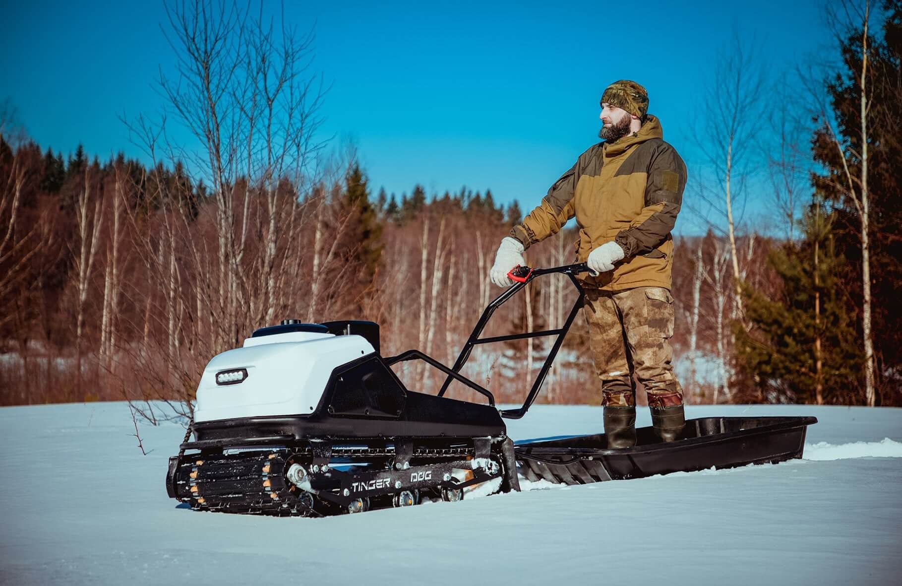 Купить мотобуксировщик TINGER DOG в нашем магазине - это приобрести надежную технику надежного производства. Бренд завоевал популярность среди рыбаков, охотников и туристов. Наиболее популярные места эксплуатации – замерзшие озера и реки, заснеженные леса и поля. Мотобуксировщик уверенно передвигается не только по накатанному снегу или насту, но и по достаточно глубокому рыхлому снегу высотой до 40 см.