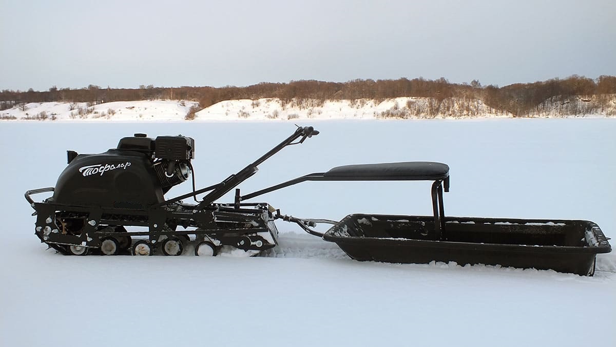 В конструкции мотовездехода используется цельная резиновая гусеница шириной 500 мм. Гусеница в сочетании с катковой подвеской способна проходить спокойно по льду и даже по территории без снега.