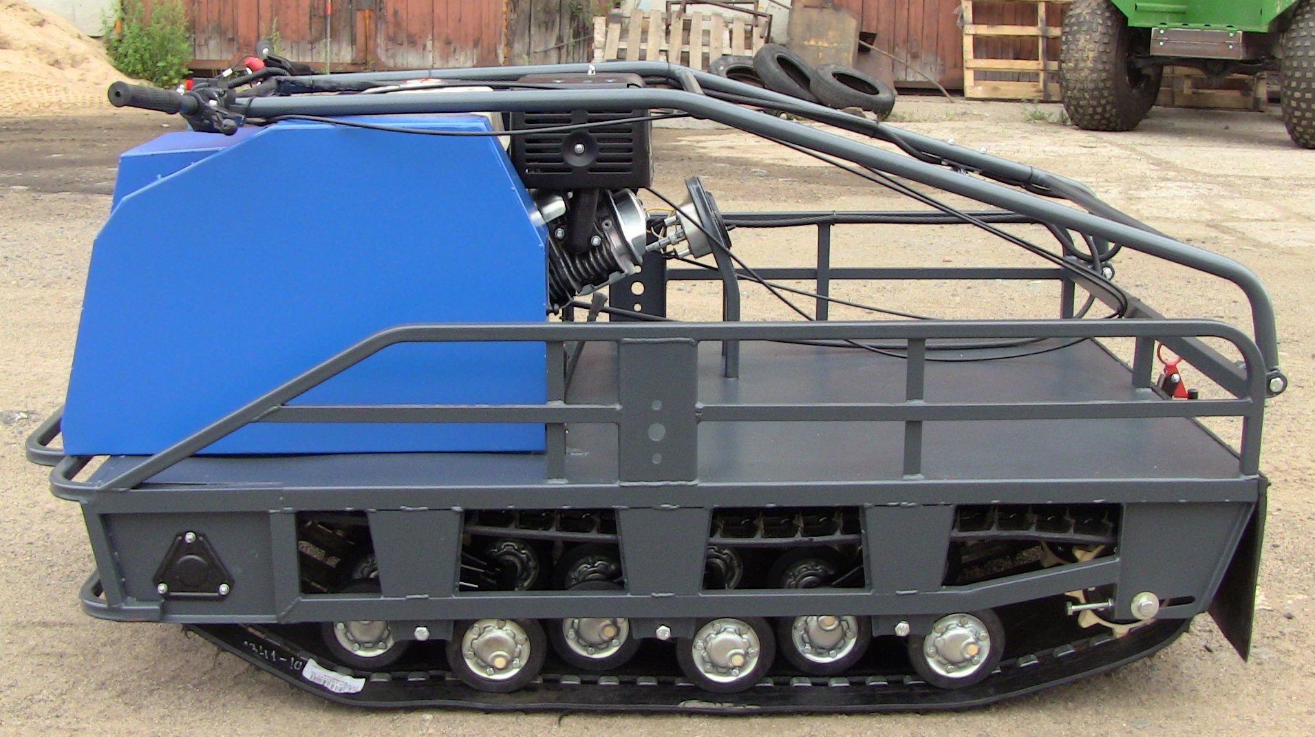 На мотобуксе установлена катковая подвеска. Катки устанавливаются на оси и предназначены для смягчения ударов и вибраций, возникающих при движении по неровной местности. Подвеска также способствует лучшей проходимости и устойчивости мотобуксировщика, обеспечивая более комфортное и безопасное передвижение как в сельской местности, так и на дорогах.