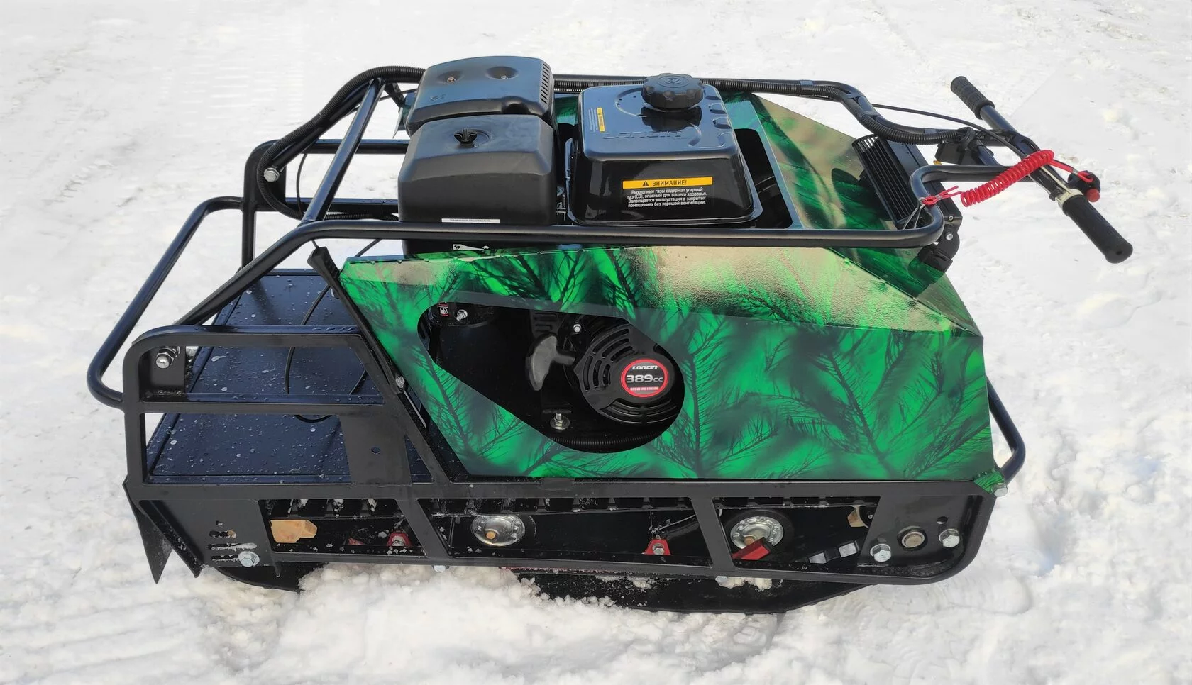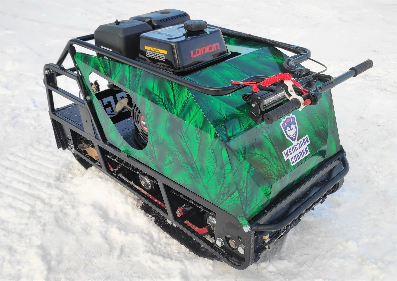 Мотособака весит 125 кг, а размер ее составляет 145 см в длину, 50 см в ширину и 74 см в высоту. Модель оснащена гусеницей шириной 500 мм. Гусеница в сочетании с катковой подвеской способна проходить спокойно по льду и даже по территории без снега.