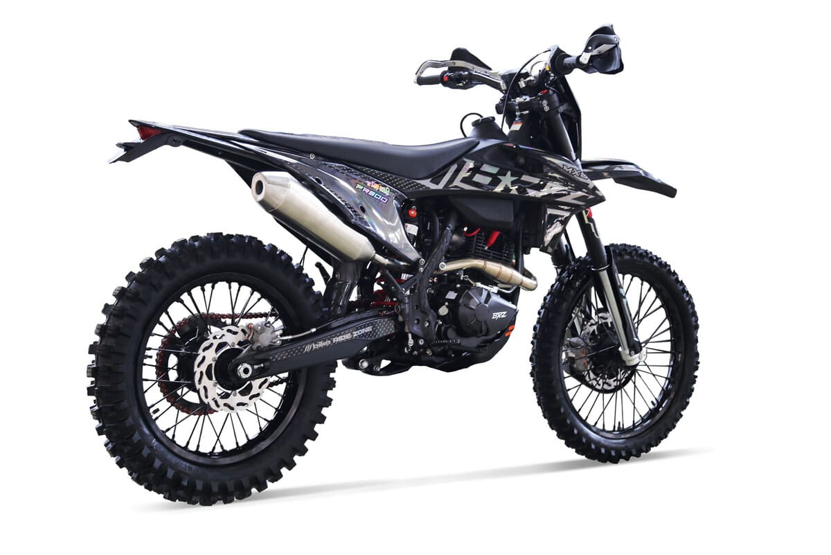 Мотоцикл BRZ MX8 PR300 23 - полноразмерная "воздушка" с мотором Zongshen ZS172FMM-5 с балансирным валом объемом 300 см3. BRZ MX8 PR300 23 хорошо сбалансированный мотоцикл по технической части. Построен на проверенной раме К8, имеет хороший надежный мотор мощностью 25 л/с, который работает в паре с карбюратором Nibbi PE30 Black. Подвеска на BRZ MX8 PR300 23 полностью регулируемая бренда MNT. Передняя вилка имеет зеркало 43мм. Мотоцикл с завода оснащен отличной резиной: спереди Gema F-Enduro 90/90-21", сзади Gema XPlorer 754 01 120/80 - 18".